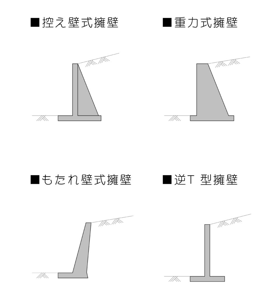 縦壁と底版で構成されており、その位置関係から逆T、L型、逆L型といったタイプがあります。